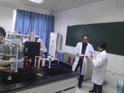 2019年5月15日下午,学院教学督导组雷克林、刘华俊、张火云在副院长和平的带领下,对本学期期中实验教学情况进行了全面检查。在N3-116实验室,豁银强老师正在进行16级食品安全专业《综合实验》教学, 学院教学督导组组长雷克林教授详细查看了课程教学方案、实验指导书、教学进度安排,并检查了部分学生实验记录情况,强调了实验室安全、实验工作守则,询问了实验开展过程中的问题及困难。在N3-301实验室,罗天雄老师正在进行《分析化学实验》教学,学院督导组集体参加了课程听课,并与罗老师进行了课程授课意见交流。