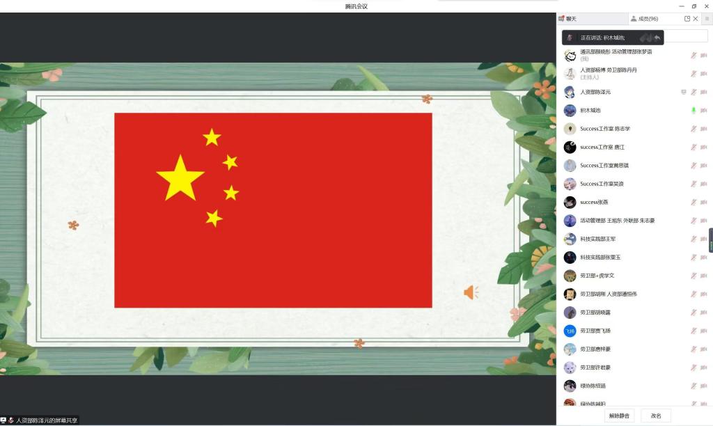 大会主要分为三项。第一项,全体成员庄严高唱国歌。大会第二项,向琼老师进行会议发言,讲话内容主要包括两方面,一方面是认为一个优秀的学生干部要有“五颗心”,这“五颗心”分别为责任心、自信心、细心、耐心和虚心,把这五颗心结合起来,才能够增强自我学习,更好地服务大家;另一方面是学生干部要做到“三自三思”,即处处自警、坚定思想,时时自思、动脑思考和常常自立、主动思维。大会第三项,各部门干事代表发言,谈谈对未来工作的展望。最后主持人宣布大会圆满结束。