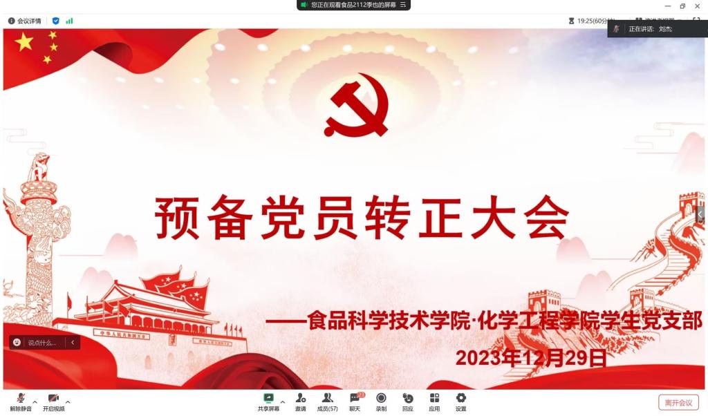 (食品·化工学院 通讯员 李睿童)为赓续党的辉煌,注入新鲜血液,食品·化工学院学生党支部于12月29日中午12点在线上召开预备党员转正大会,学工办主任包静及全体学生党员参加此次会议。