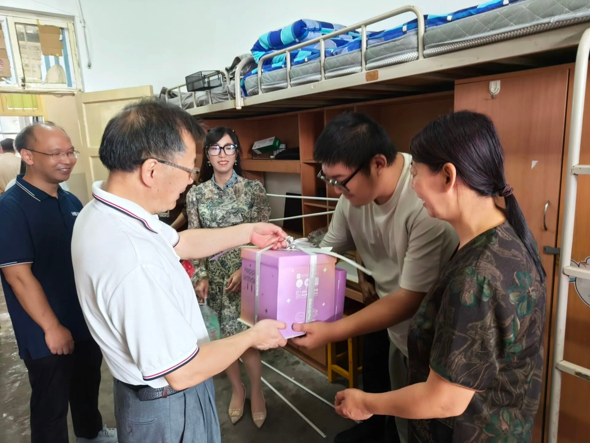 走访过程中,储杰、刘志新仔细检查了宿舍的设施设备,卫生状况以及生活条件。储杰还要求同学们加强寝室清洁管理,保持宿舍环境卫生,展现食化学院的纪律与风采。 在宿舍走访过程中,两位书记就大一新生提出的各种问题进行了详尽的解答,同2025级新生进行亲切交谈,询问同学们的家乡家庭情况、对专业的了解程度等,鼓励大家以积极的心态和良好的面貌去面对大学校园生活,勉励大家学好专业技能、加快角色转变、早日熟悉校园,提出宝贵建议,告诉同学们要劳逸结合,关注身体健康与心理健康。提醒同学们在平常生活中务必注意财产安全、用电安全和人身安全,谨防诈骗。走访当天正好是一位新生的生日,学院领导亲手为这位学生送上生日蛋糕并为其送上学院诚挚的祝福,让其体会到了属于食化大家庭的一份温暖。